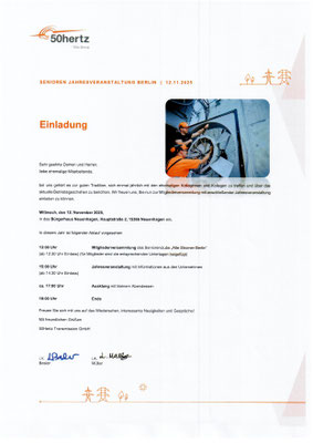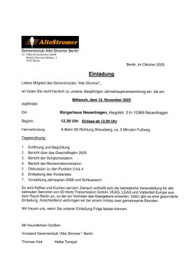 14.10.2025 - Einladung zur Jahreshauptversammlung des Seniorenclubs „Alte Stromer“,
